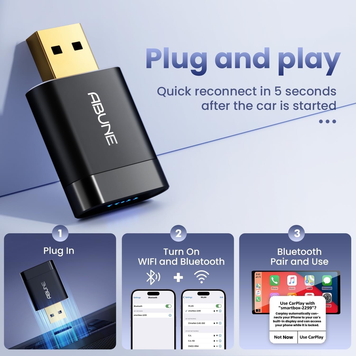 - 🚀【Seamless Wireless Upgrade in Seconds】: Transform your drive with this wireless CarPlay adapter—perfect for commutes, or weekend trips. Plug into your car's data USB port, pair via Bluetooth, and in under 30 seconds enjoy wireless music, maps, and calls. Keep your phone charging and your car cable-free. This 2025 Mini wireless CarPlay adapter delivers instant connectivity and lasting convenience, making every journey smoother with reliable Wireless CarPlay & Android Auto