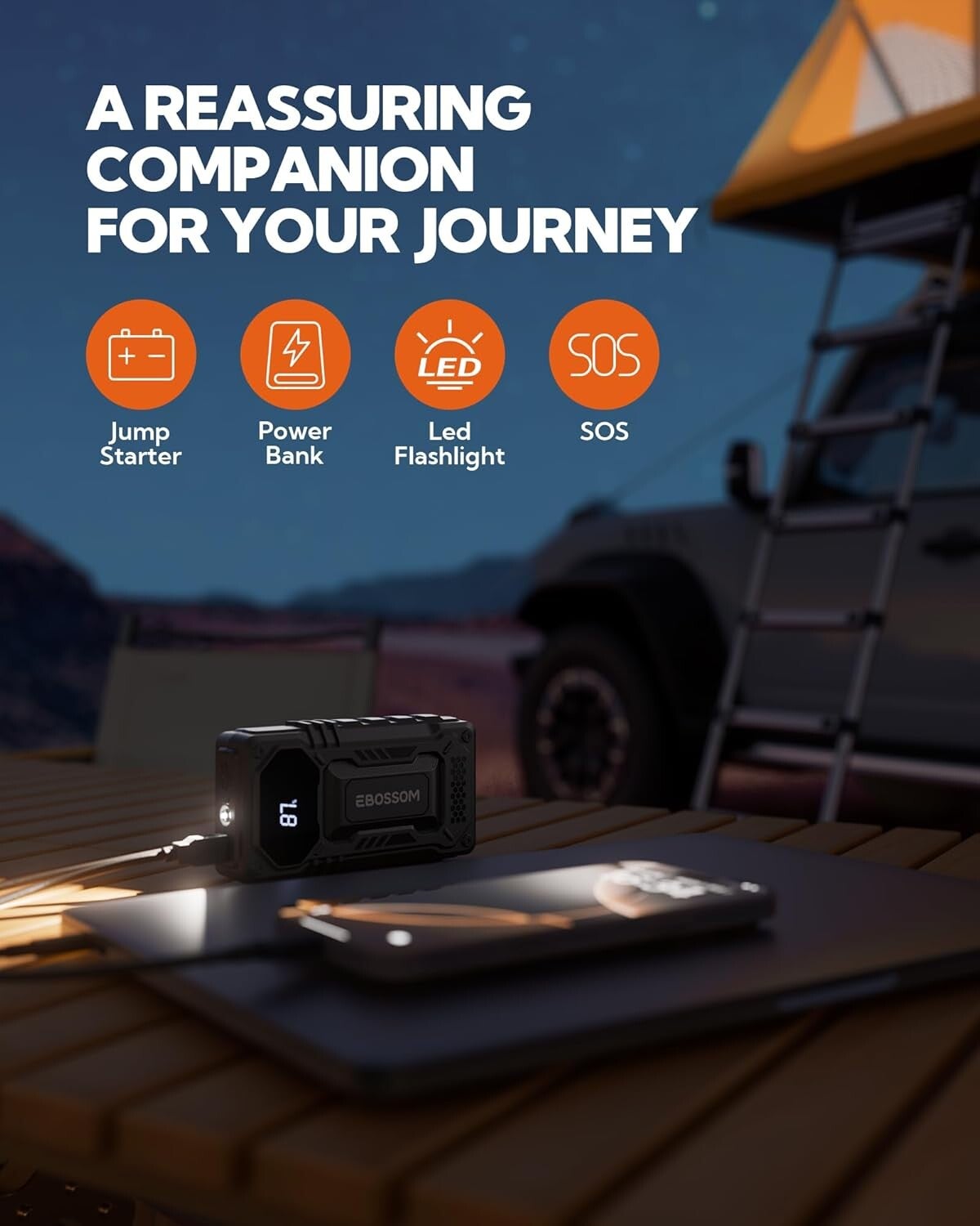 - WHAT YOU GET :EBOSSOM jump pack (1* Portable Car Battery Booster, 1* Smart jumper cables, 1* USB-C charging cable, 1* user manual, 1* portable Flannel storage bag, Lifetime tech support.