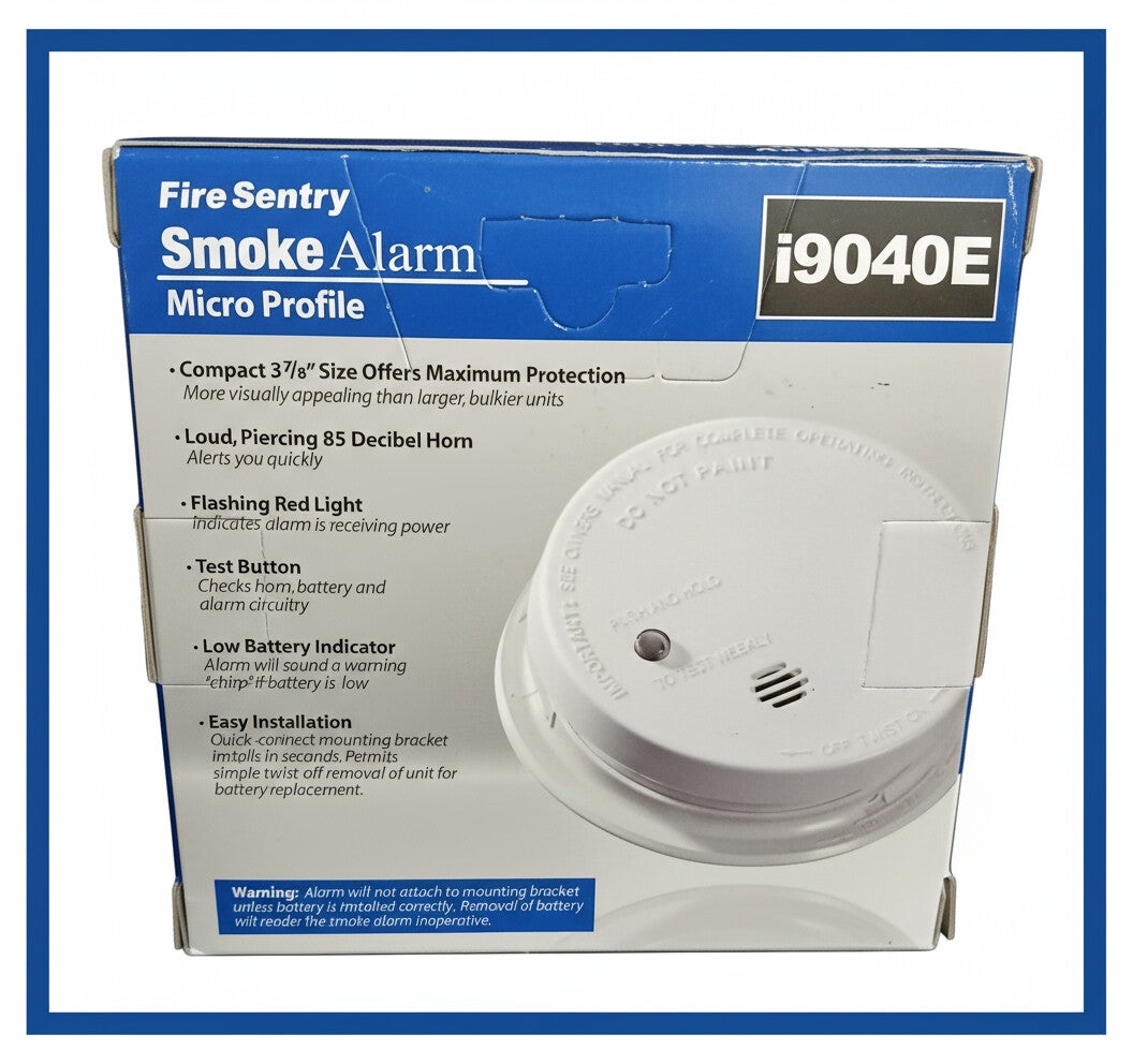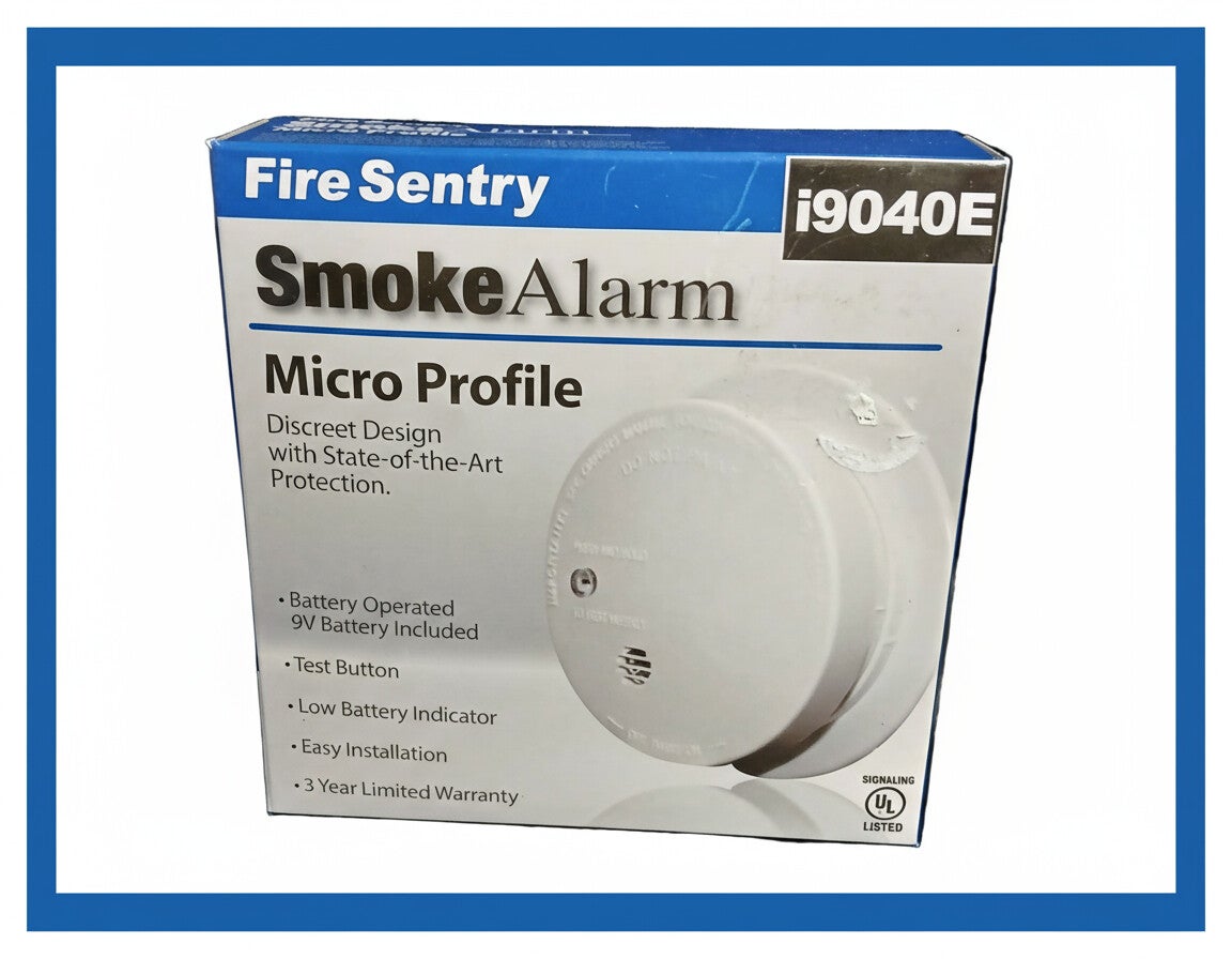 This is new in the box. The Fire Sentry i9040 smoke alarm is a battery operated smoke alarm that utilizes ionization sensing technology. The four (4) inch unit is smaller in diameter giving it discreet design with the same quality you would expect in a Kidde manufactured product. The i9040 is powered by a 9V battery, providing continuous protection, even during power outages. This easy to install unit includes a test button to verify the detection electronics are working as intended. Benefits The Fire Sentry i9040 battery operated, single station smoke alarm provides an early warning signal to you and your family in the event of a fire hazard. The i9040 operates on a 9V battery power source that provided continuous protection even during a power outage, Installation is easy, no wiring required. This unit is UL Listed and includes a 3 year limited warranty. This alarm uses ionization sensing technology. Ionization sensing alarms may detect invisible fire particles (associated with flaming fires) sooner than photoelectric alarms. Photoelectric sensing alarms may detect visible particles (associated with smoldering fires) sooner than ionization alarms. Kidde strongly recommends that both ionization and photoelectric smoke alarms be installed to help insure maximum detection of the various types of fire that can occur within the home.