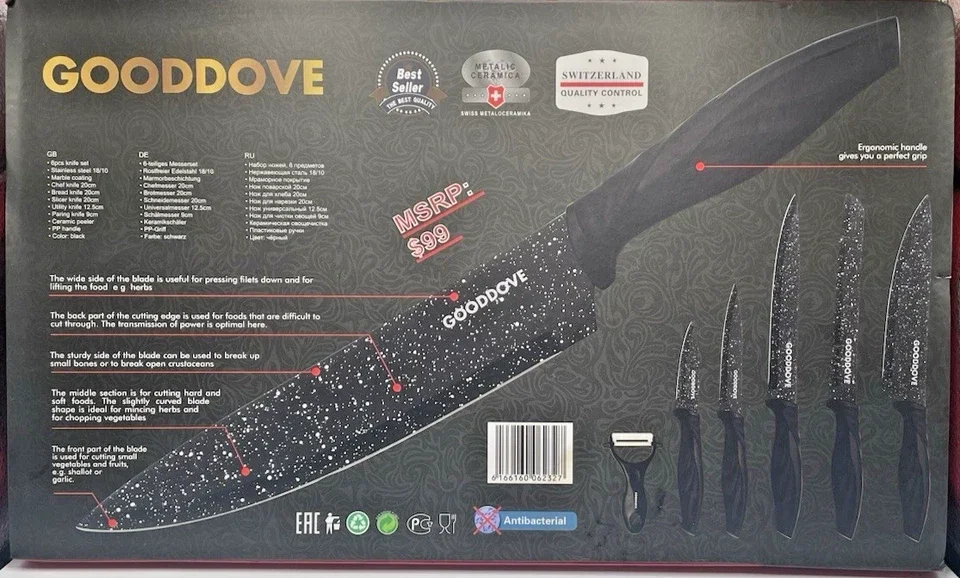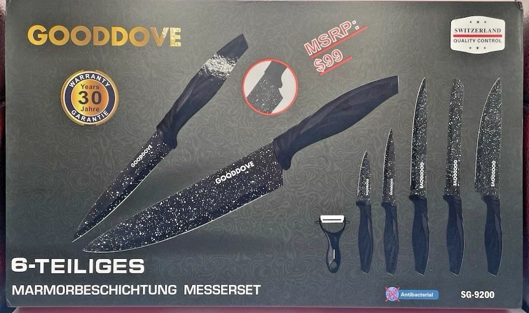 This is new in the box. The Gooddove SG-9200 Kitchen Knife Set includes 6 knives made of stainless steel, featuring straight blade edges. The set is designed for cutting vegetables and meats, with a sleek black color that adds a stylish touch to any kitchen. Manufactured in China, this knife set is perfect for those looking for a durable and versatile set to enhance their culinary experience.