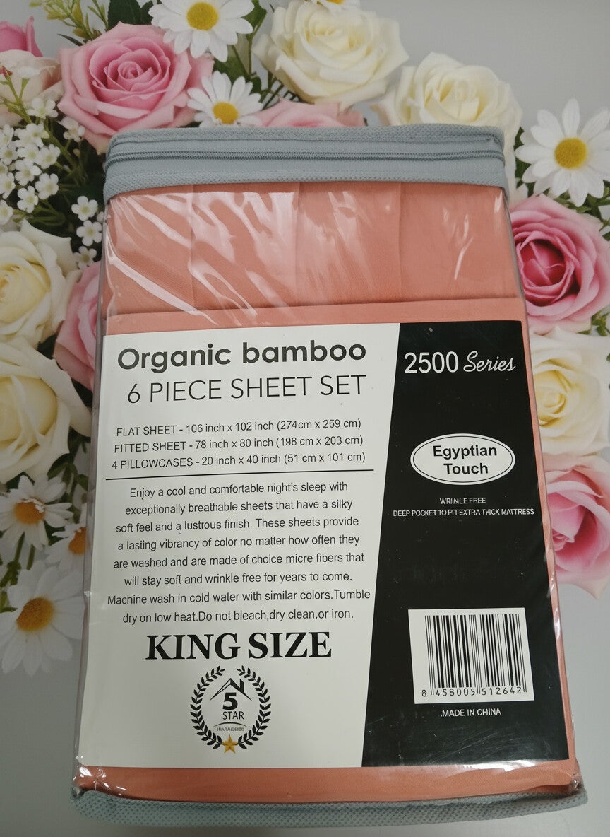 New in package. Indulge in luxury with this 6-piece sheet set crafted from organic bamboo. Add a touch of elegance to your bedroom. The set includes a king-sized sheet set, perfect for cozying up in style. The Egyptian Touch brand guarantees quality, making this a must-have addition to your bedding collection. The bamboo material is not only durable but also breathable, ensuring a comfortable sleeping experience. Ideal for anyone looking for a premium sheet set, this Egyptian Touch sheet set is a perfect choice.