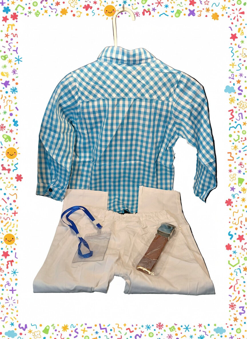 Item is new with tags. 4 piece set includes: shirt, pants, belt, and ID/Photo holder. Size 8