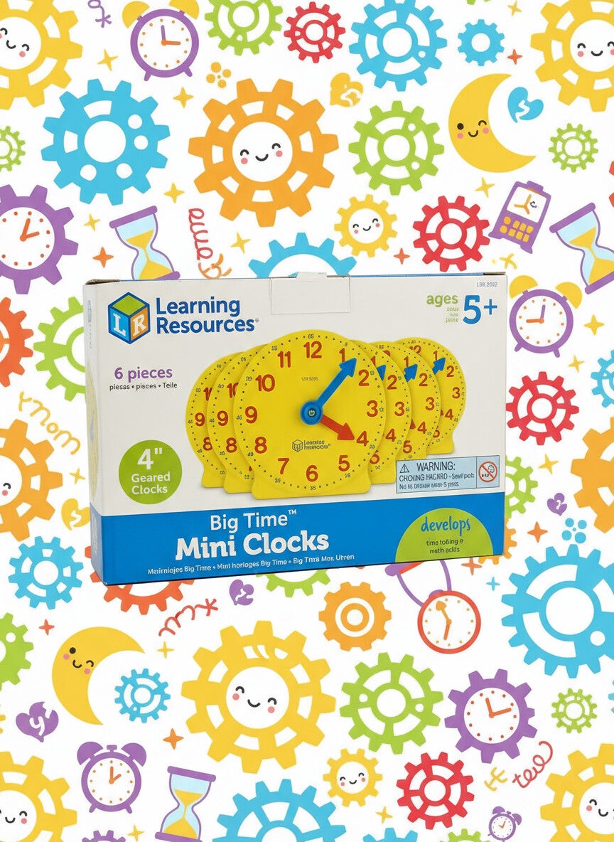 The Learning Resources Big Time Geared Mini Clocks are designed to help young learners build essential time-telling skills. This set includes six 10cm geared clocks, perfect for small group learning in classrooms or at home. The hidden gear mechanism ensures that the hour and minute hands move accurately together, reinforcing correct time concepts. New in the box.
