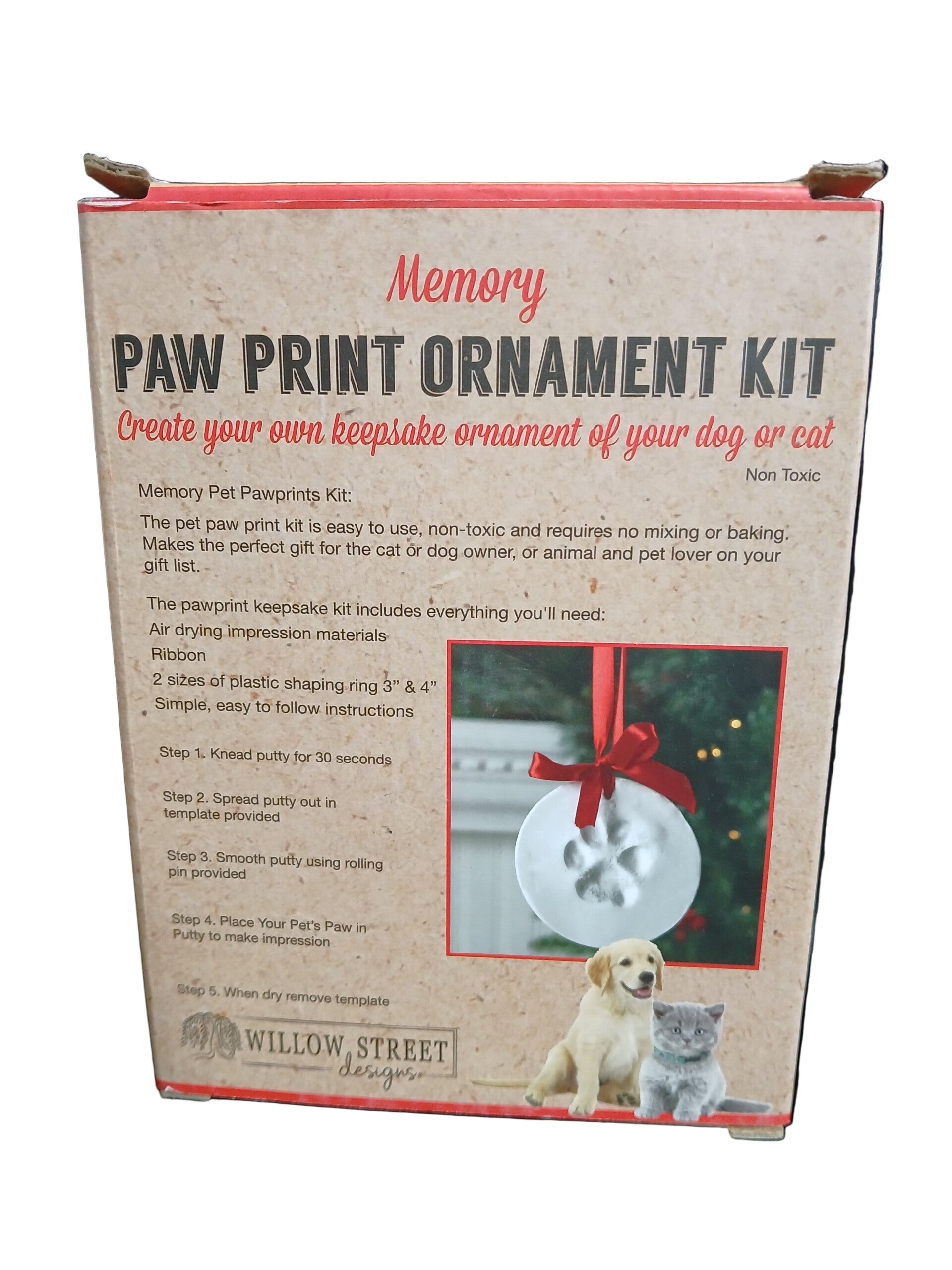 Craft kit specifically designed for making keepsakes ornaments with paw prints, perfect for remembering beloved pets. This kit includes all the necessary materials and instructions to create personalized ornaments, allowing users to easily customize them with their dog or cat's paw print. It is a unique and heartfelt way to honor and commemorate furry friends. This item is new in the box.