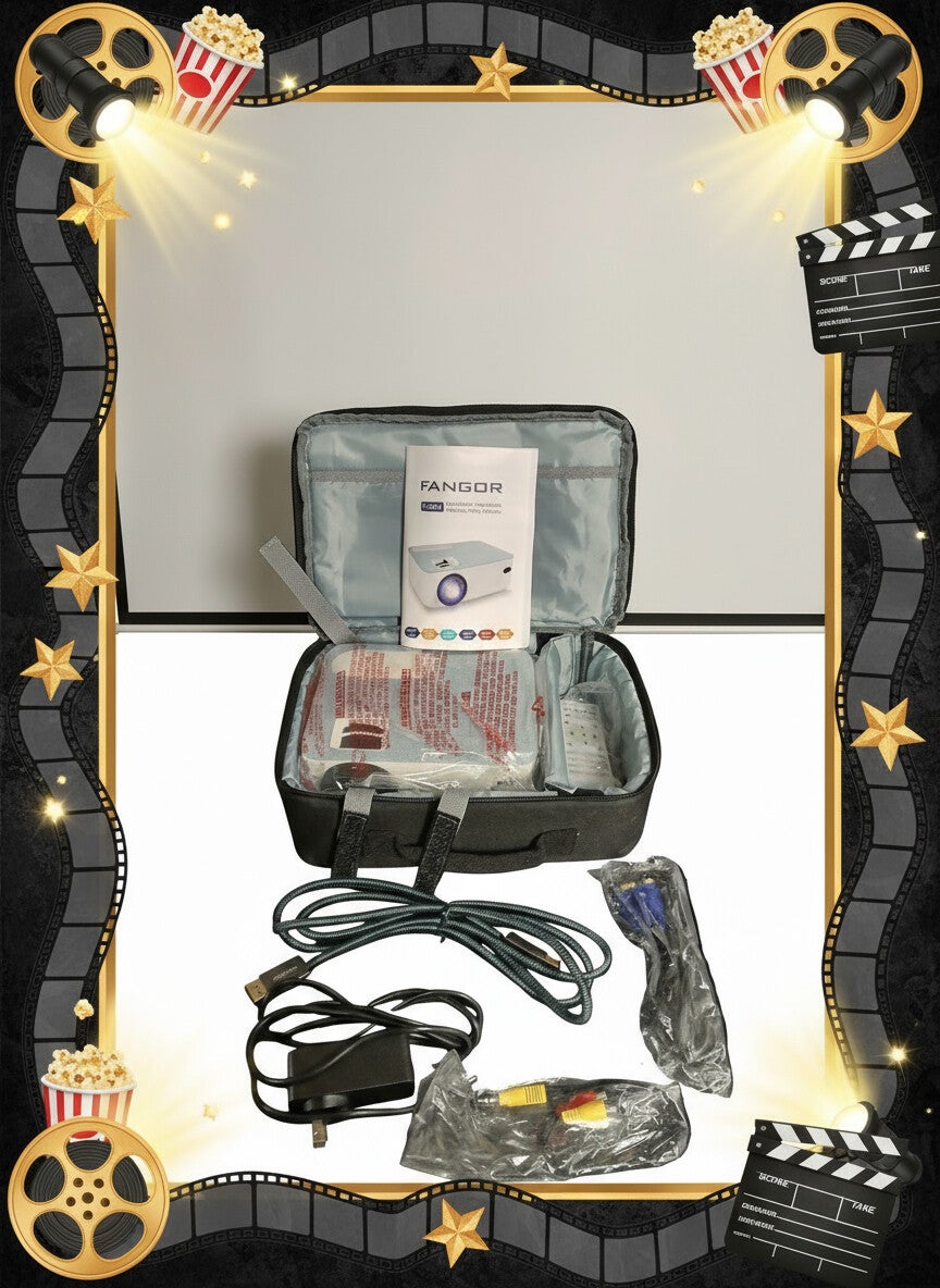The FANGOR 206A is a portable projector that supports 1080p resolution and features built-in dual speakers with Bluetooth connectivity. It offers a large projection size from 30 to 200 inches and has a variety of input options, including HDMI, VGA, USB, and Micro SD. The projector is marketed as suitable for home entertainment and outdoor use.